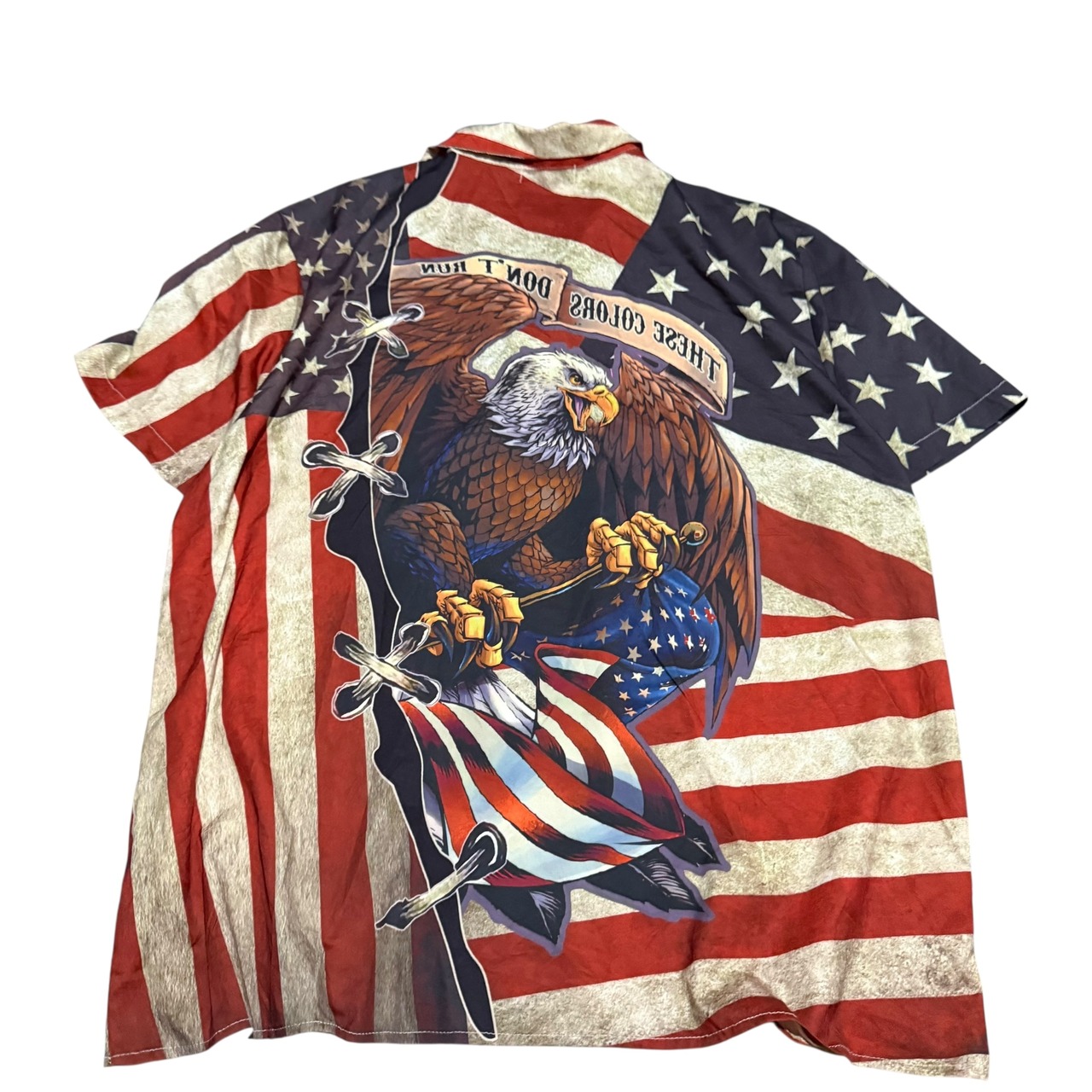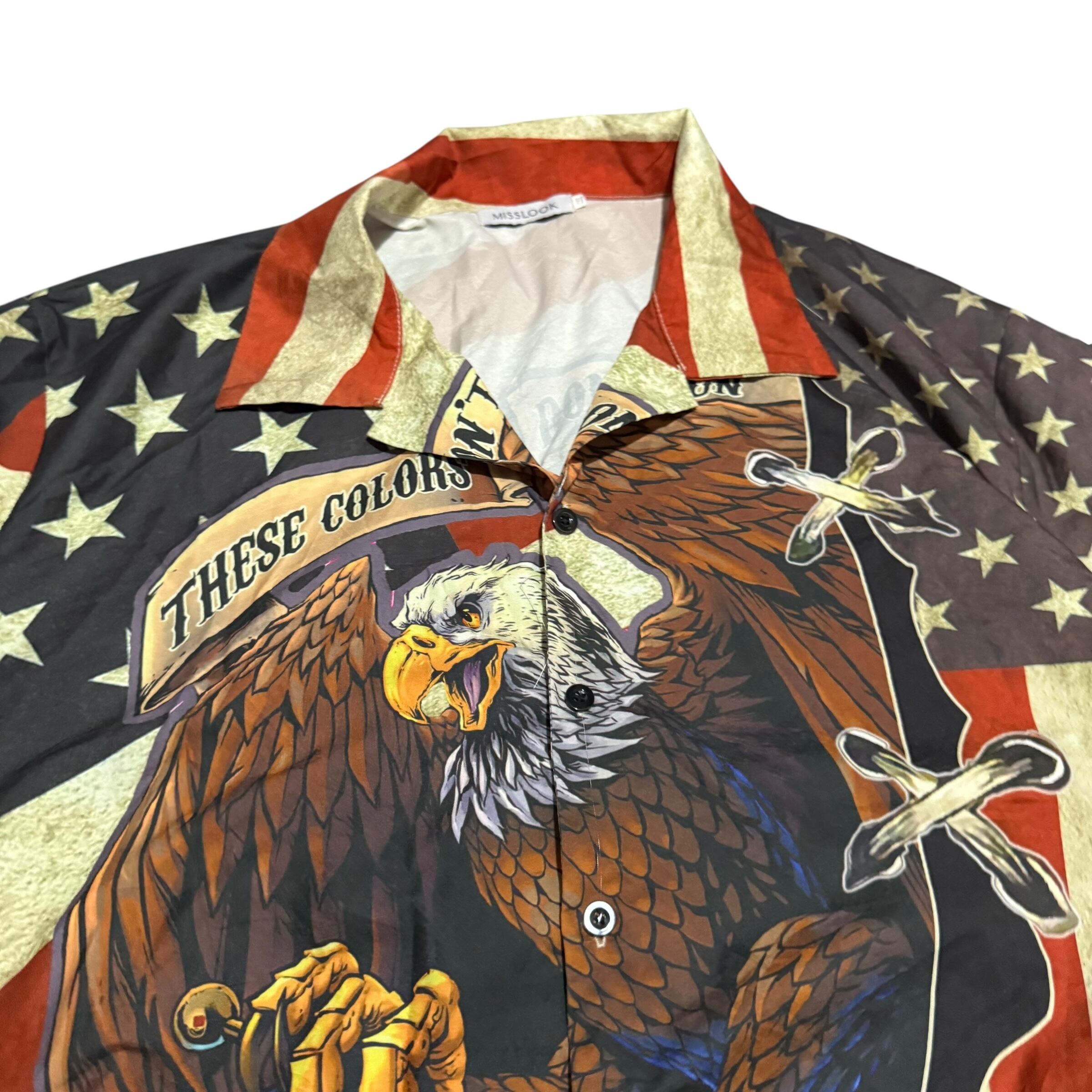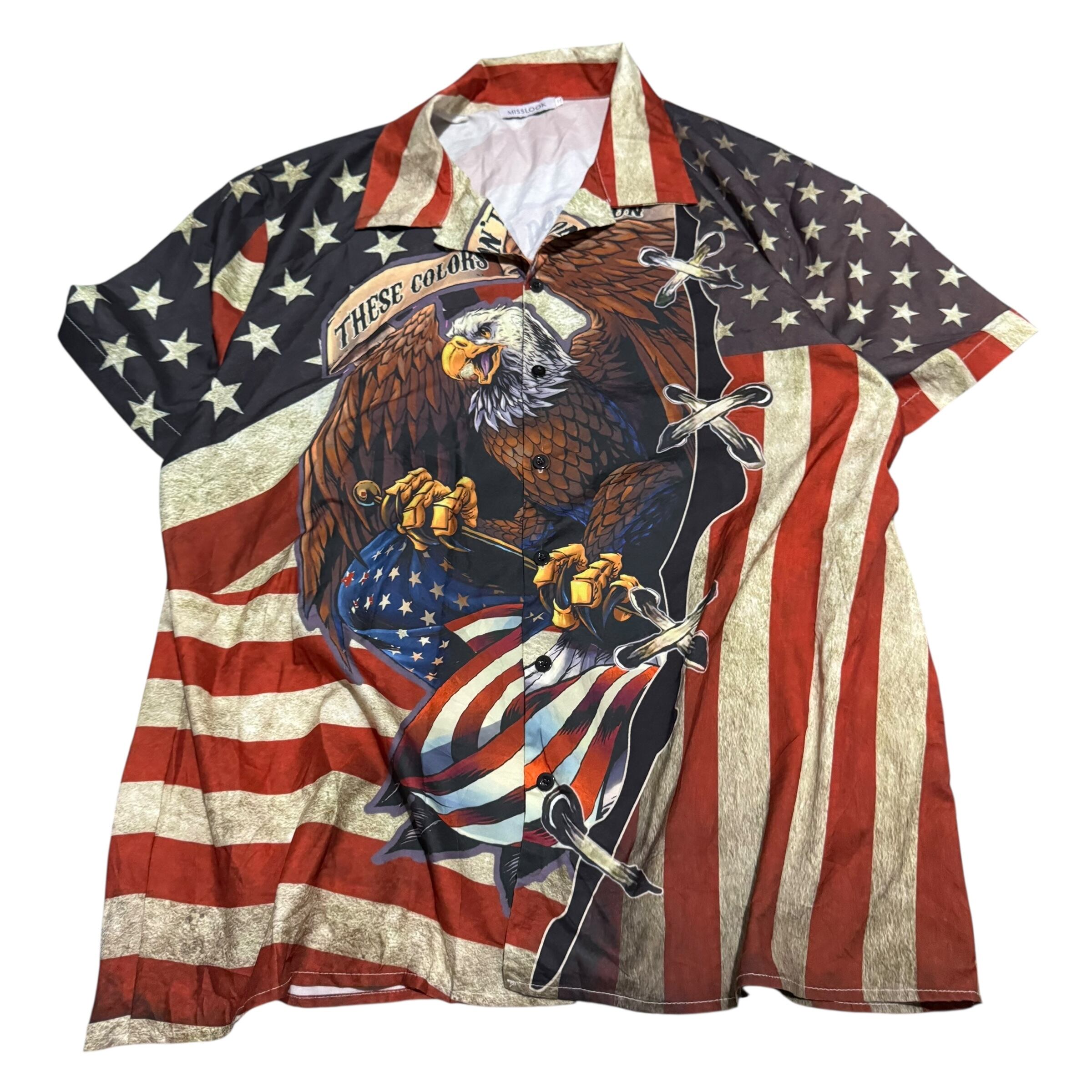 【No785 日本メンズ3XL 半袖 柄シャツ 着丈 身幅 肩幅 アメリカンフラッグ イーグル サラサラ ポリエステル 】