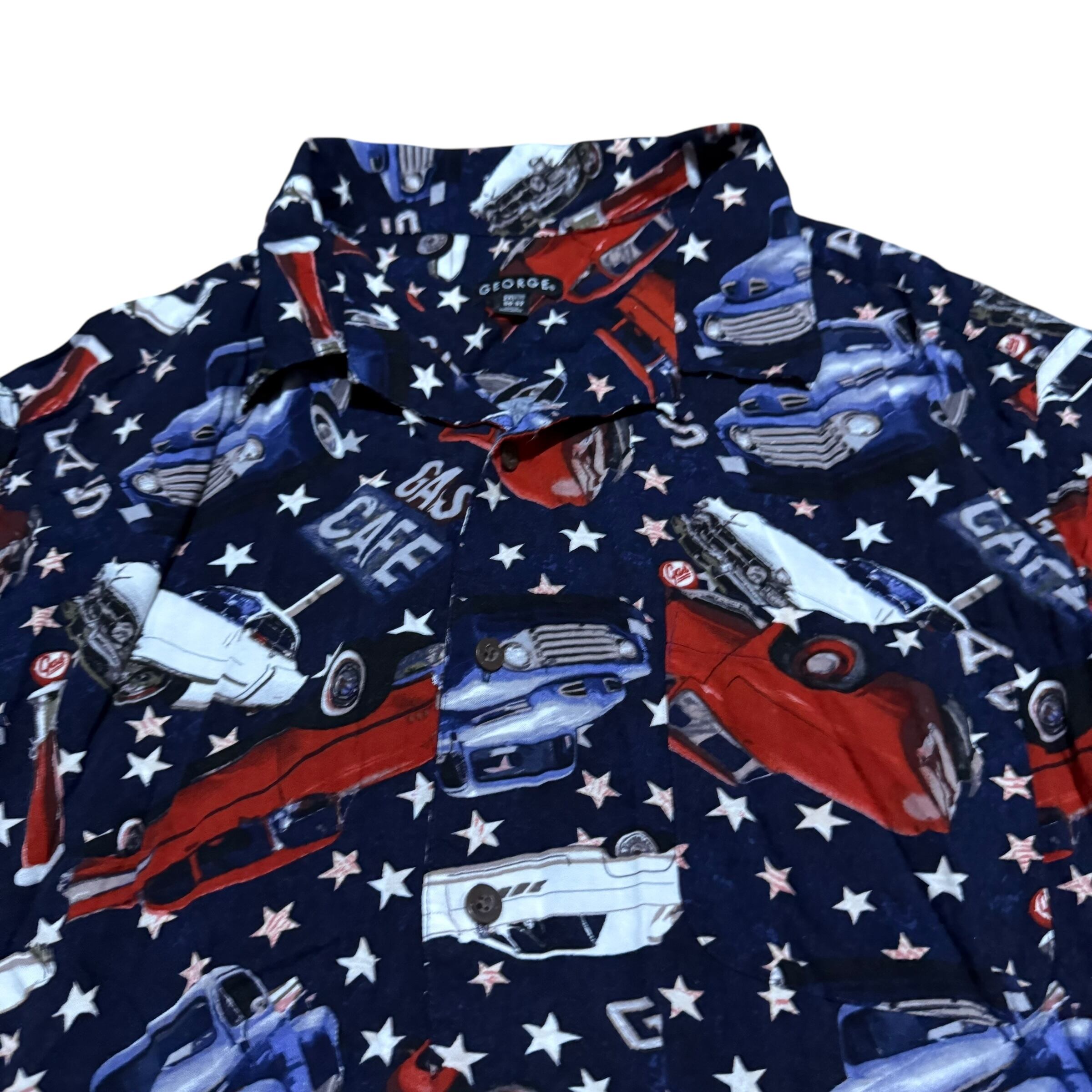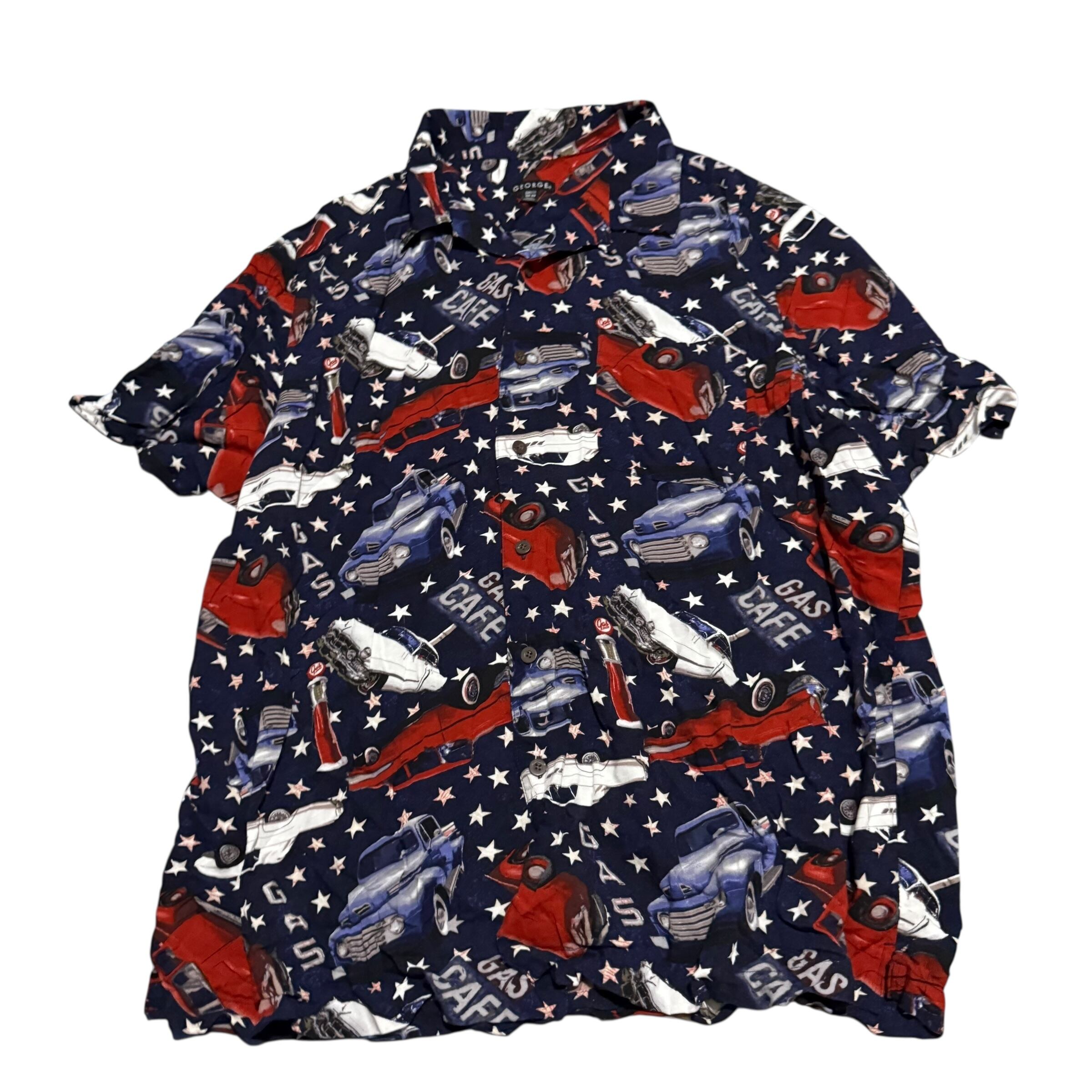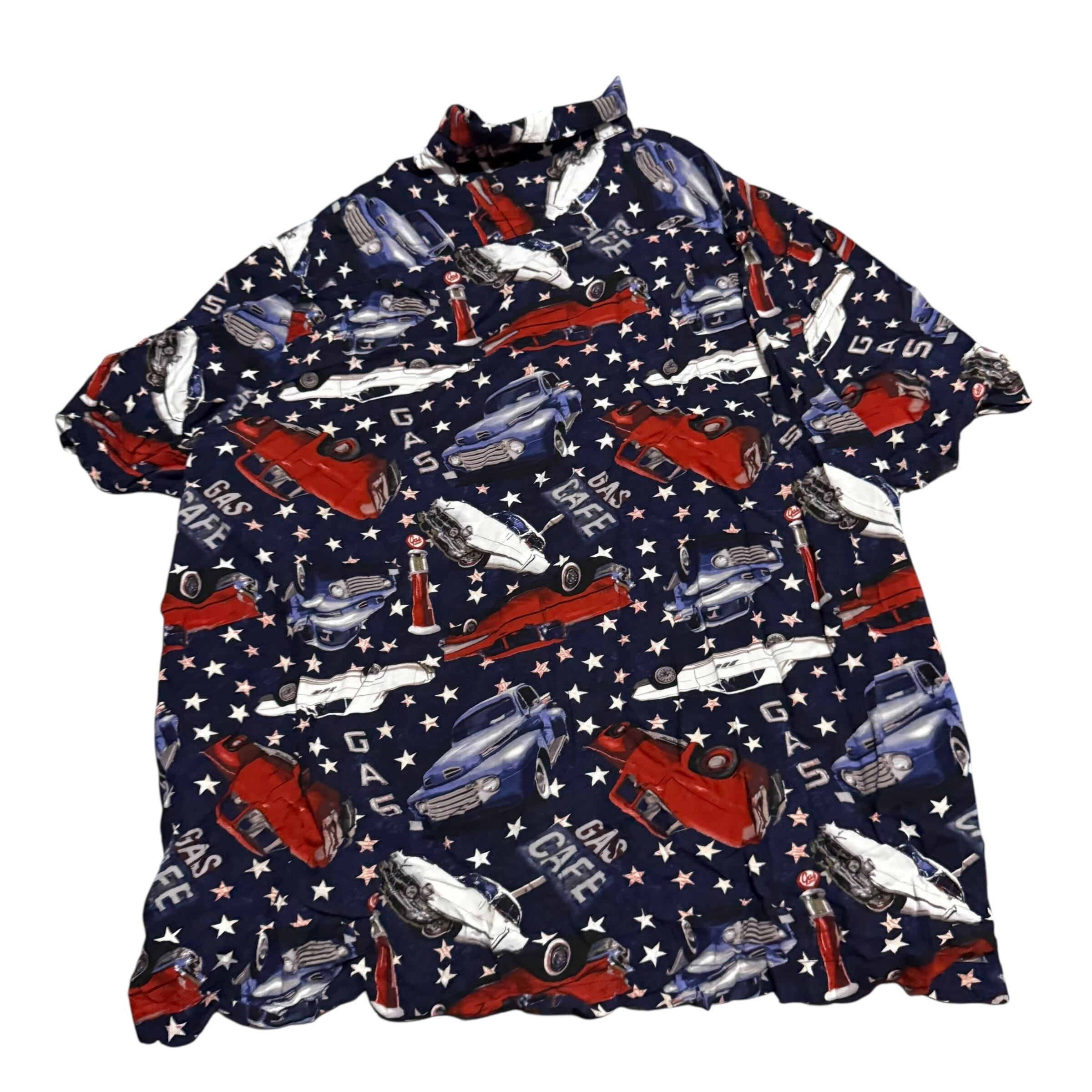【No791 日本メンズ3XL 半袖 柄シャツ 着丈 身幅 肩幅 レーシング くるま レトロカー レーヨン】